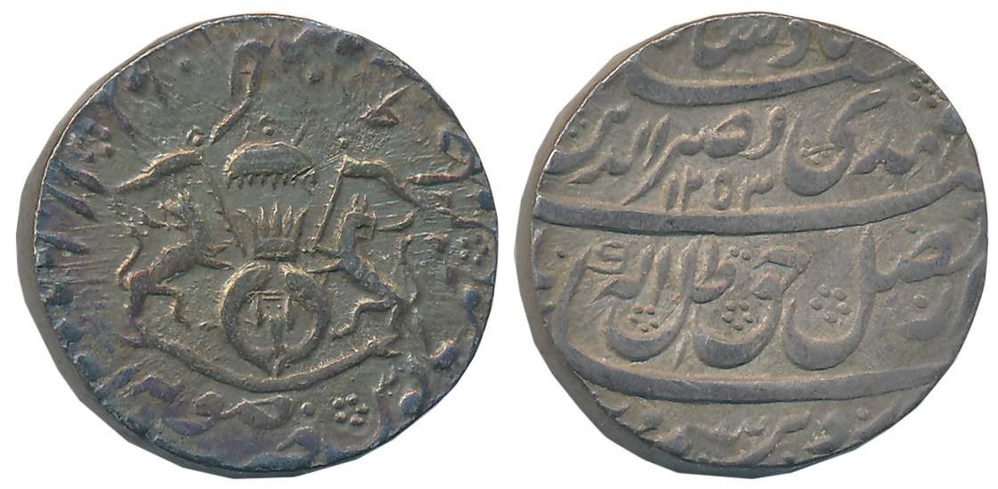Nasir ud Din Haidar Shah, Silver Rupee, 11.14g, Suba Awadh Dar us Sultanate Lakhnau Mint, AH 1253/ RY 9, Crown flanked by rampant Lions holding flag, two upright Fish on obverse (Master & Kapoor# 8.51). Very fine+.