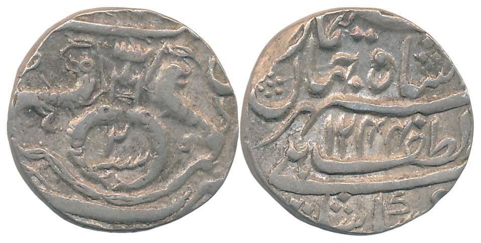 Nasir ud din Haider Shah, Silver 1/2 Rupee, 5.54g, Dar ul Sultanate Lakhnau Suba Awadh Mint, in the name of Sulayman Jah, AH 1244/ RY 2, Crown flanked by rampant Lions holding flag, two upright Fish below on obverse (Not listed in Master & Kapoor). About extremely fine, very rare.