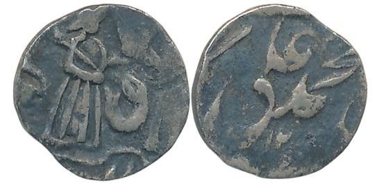 Muhammad Ali Shah, Silver 1/16 Rupee- 1 Anna, 0.69g, Suba Awadh Dar us Sultanate Lakhnau Mint, Obv: Legend “Muhammad Ali”, Rev: Crowned & Fish flanked by people (Not listed in Major catalogue). Very fine, extremely rare.