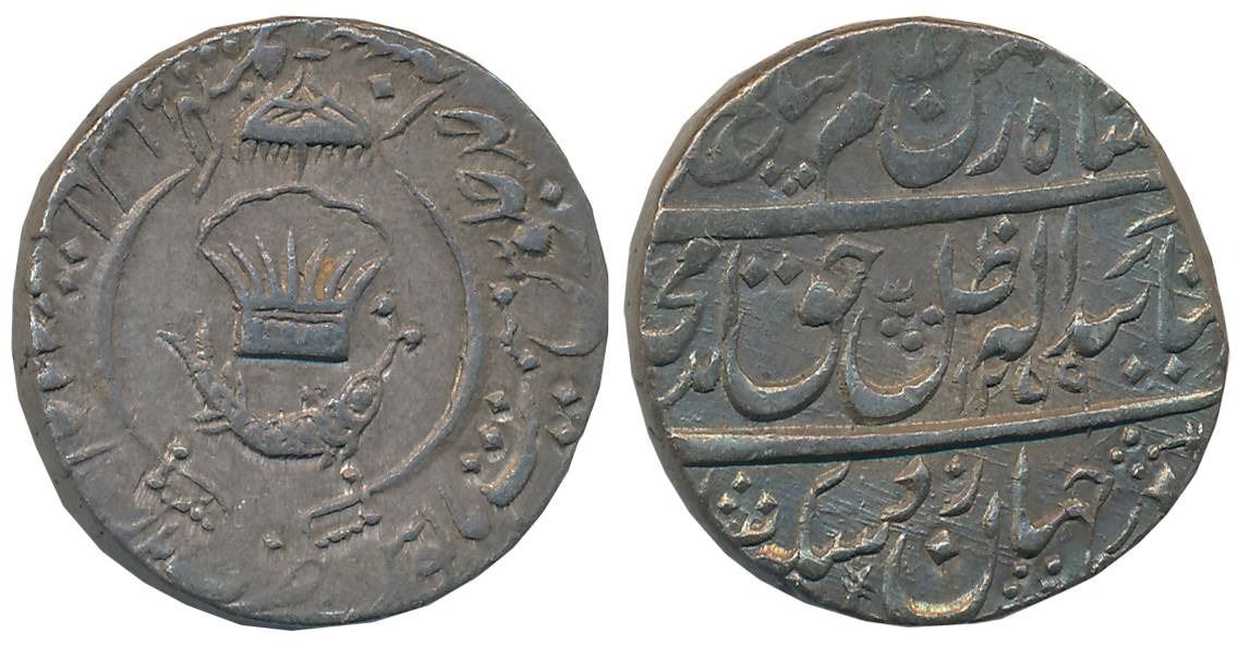 Amjad Ali Shah, Silver Rupee, 11.11g, Mulk Awadh Bait us Sultanate Lakhnau Mint, AH 1259/ RY Ahad, Crown above Fish on obverse (Master & Kapoor# 10.06). Extremely fine.