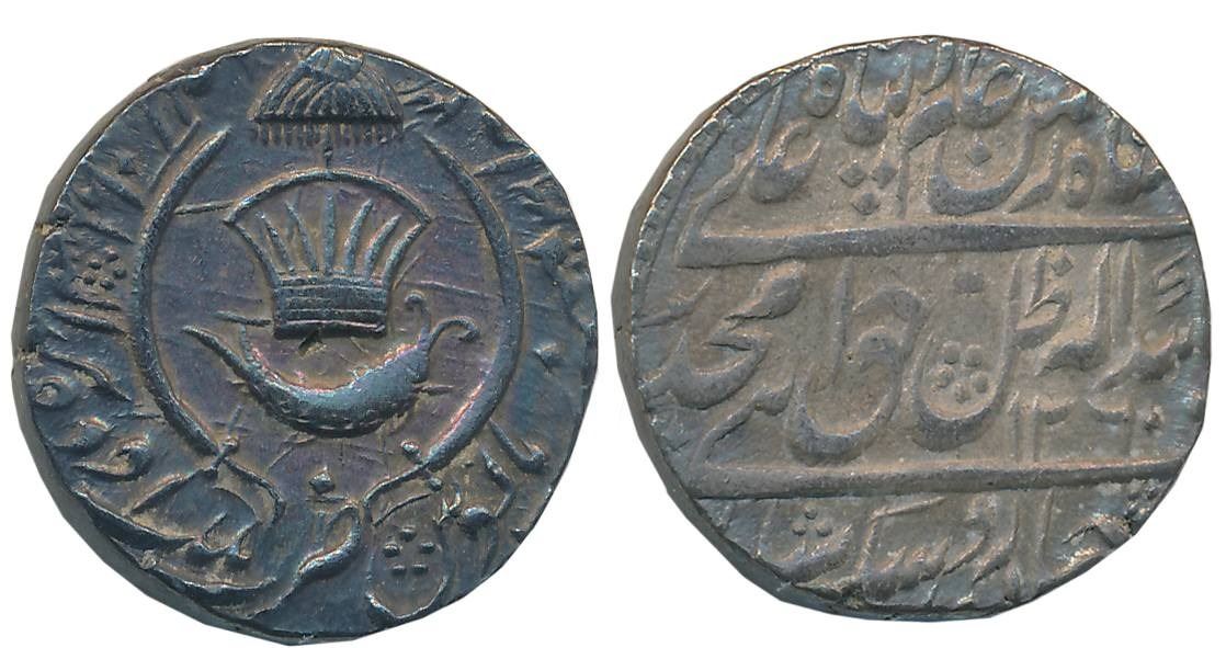 Amjad Ali Shah, Silver Rupee, 11.17g, Mulk Awadh Bait us Sultanate Lakhnau Mint, AH 1260/ RY 2, Crown above Fish on obverse (Master & Kapoor# 10.13). Very fine+.