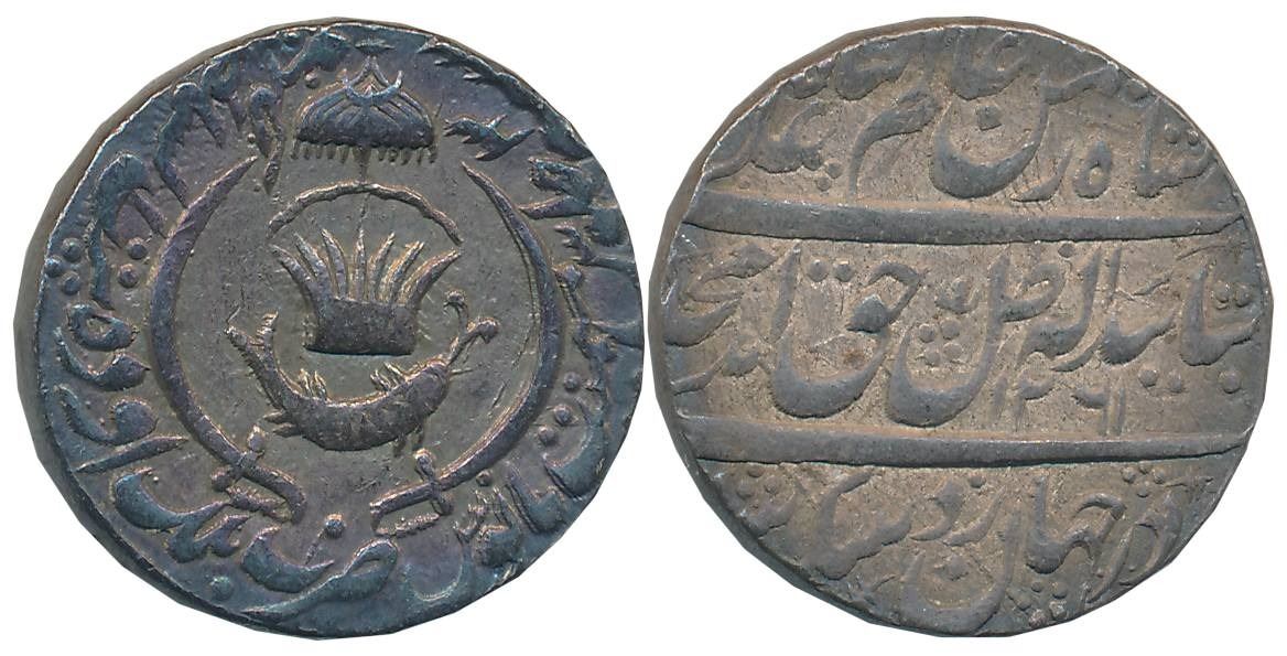 Amjad Ali Shah, Silver Rupee, 11.14g, Suba Awadh Bait us Sultanate Lakhnau Mint, AH 1261/ RY 3, Crown above Fish on obverse (Master & Kapoor# 10.18). Very fine+.