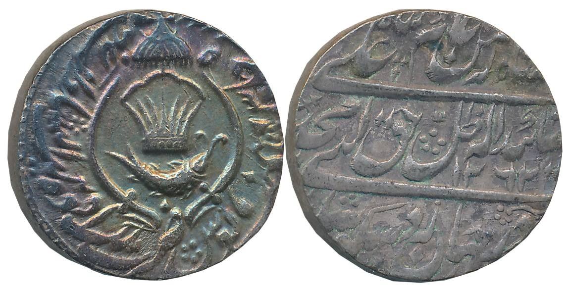 Amjad Ali Shah, Silver Rupee, 11.14g, Suba Awadh Bait us Sultanate Lakhnau Mint, AH 1262/ RY 5, Crown above Fish on obverse (Master & Kapoor# 10.26). Beautifully toned, about uncirculated.