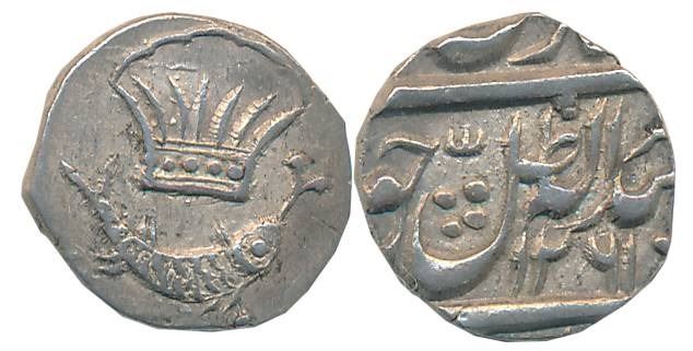 Amjad Ali Shah, Silver 1/8 Rupee- 2 Anna, 1.40g, Mulk Awadh Bait us Sultanate Lakhnau Mint, AH 1261, Crown above Fish on obverse (Master & Kapoor# 10.21). About extremely fine, very rare.