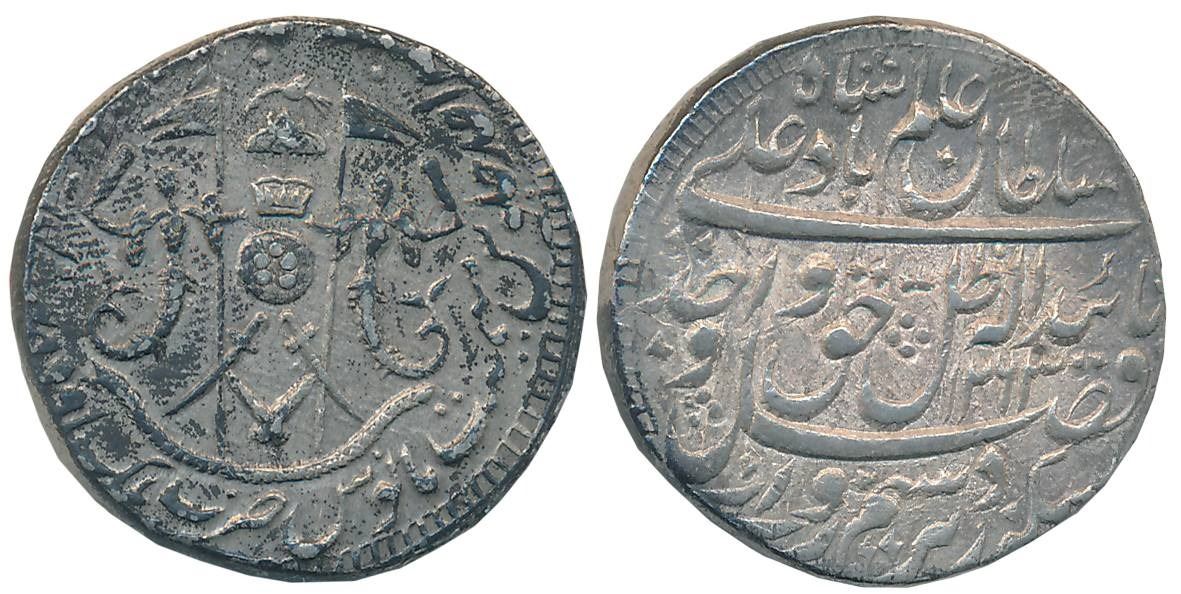 Wajid Ali Shah, Silver Rupee, 11.14g, Mulk Awadh Bait us Sultanate Lakhnau Mint, AH 1263/ RY Ahad, Parasol above crown flanked by Mermaids, crossed swords below on obverse (Master & Kapoor# 11.02). Very fine.