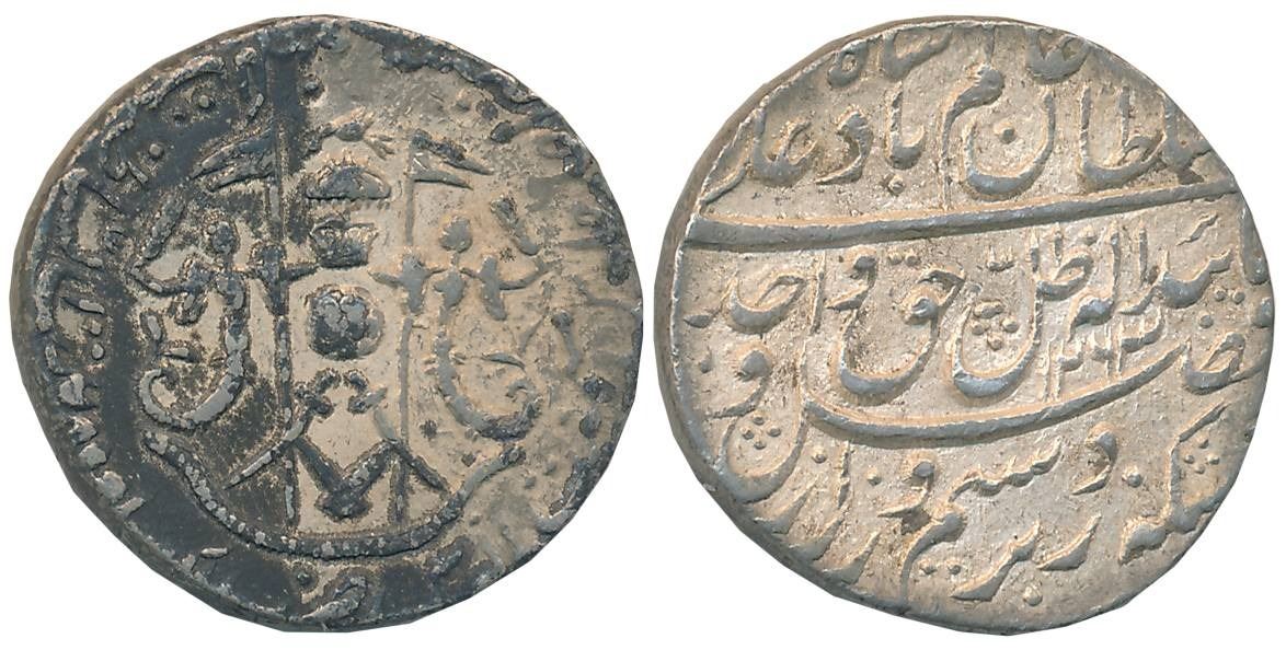 Wajid Ali Shah, Silver Rupee, 11.03g, Mulk Awadh Baitu us Sultanate Lakhnau Mint, AH 1263/ RY Ahad, Parasol above crown flanked by Mermaids holding flag crossed swords below on obverse (Master & Kapoor# 11.02). About very fine.