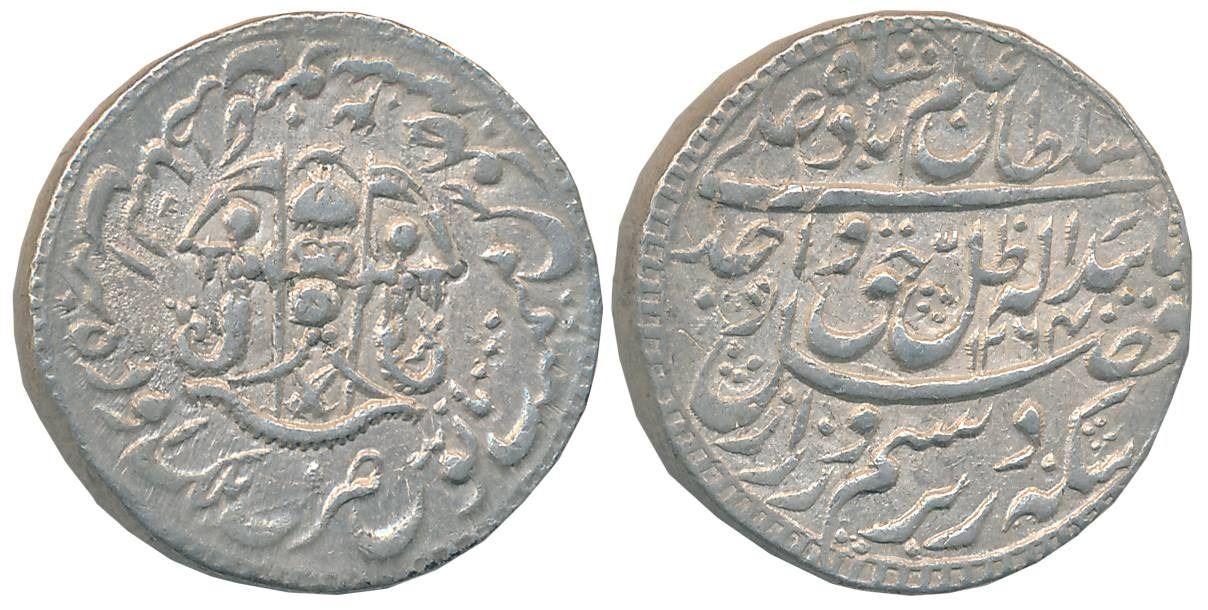 Wajid Ali Shah, Silver Rupee, 11.10g, Mulk Awadh Bait us Sultanate Lakhnau Mint, AH 1264/ RY 2, Parasol above crown flanked by Mermaids holding flag crossed swords below on obverse (Master & Kapoor# 11.08). Very fine+.