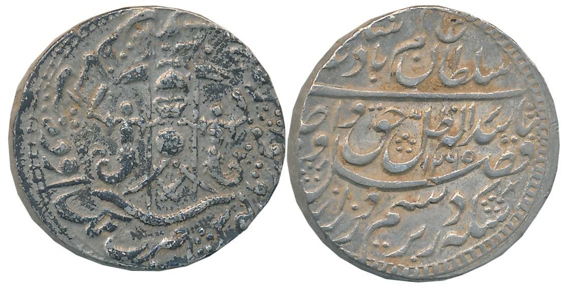 Wajid Ali Shah, Silver Rupee, 11.13g, Mulk Awadh Bait us Sultanate Lakhnau Mint, AH 1265/ RY 3, Parasol above crown, flanked by Mermaids holding flag, crossed swords below on obverse (Master & Kapoor# 11.18). Very fine.