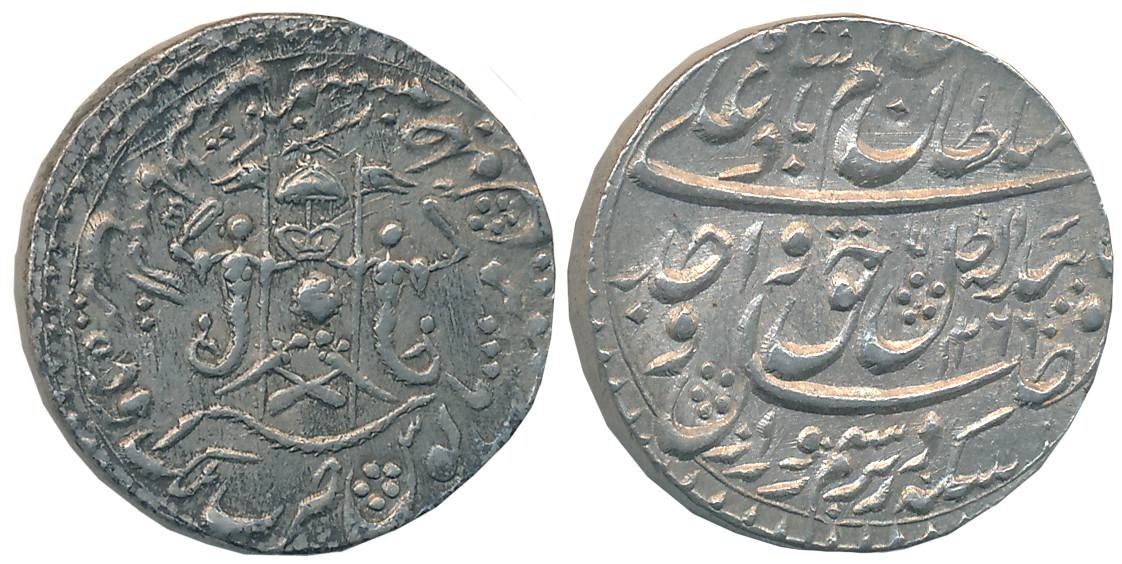 Wajid Ali Shah, Silver Rupee, 11.14g, Mulk Awadh Baitu us Sultanate Lakhnau Mint, AH 1266/ RY 3, Parasol above crown flanked by Mermaids holding flag crossed swords below on obverse (Master & Kapoor# 11.23). Very fine.