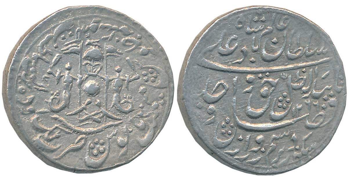Wajid Ali Shah, Silver Rupee, 11.09g, Bait us Sultanate Lakhnau Mulk Awadh Akhtarnagar Mint, AH 1266/ RY 3, Parasol above crown, flanked by Mermaids holding flag, crossed swords below on obverse (Master & Kapoor# 11.24). Very fine.