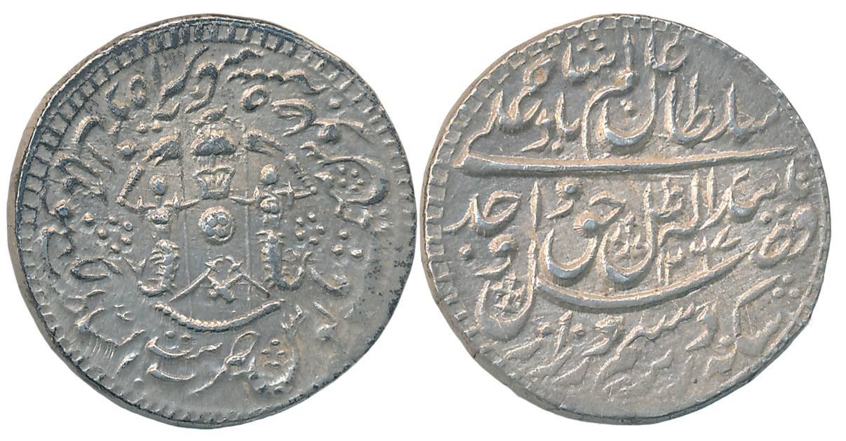 Wajid Ali Shah, Silver Rupee, 11.14g, Bait us Sultanate Lakhnau Mulk Awadh Akhtarnagar Mint, AH 1267/ RY 5, Parasol above crown, flanked by Mermaids holding flag, crossed swords below on obverse (Master & Kapoor# 11.36). Very fine+.
