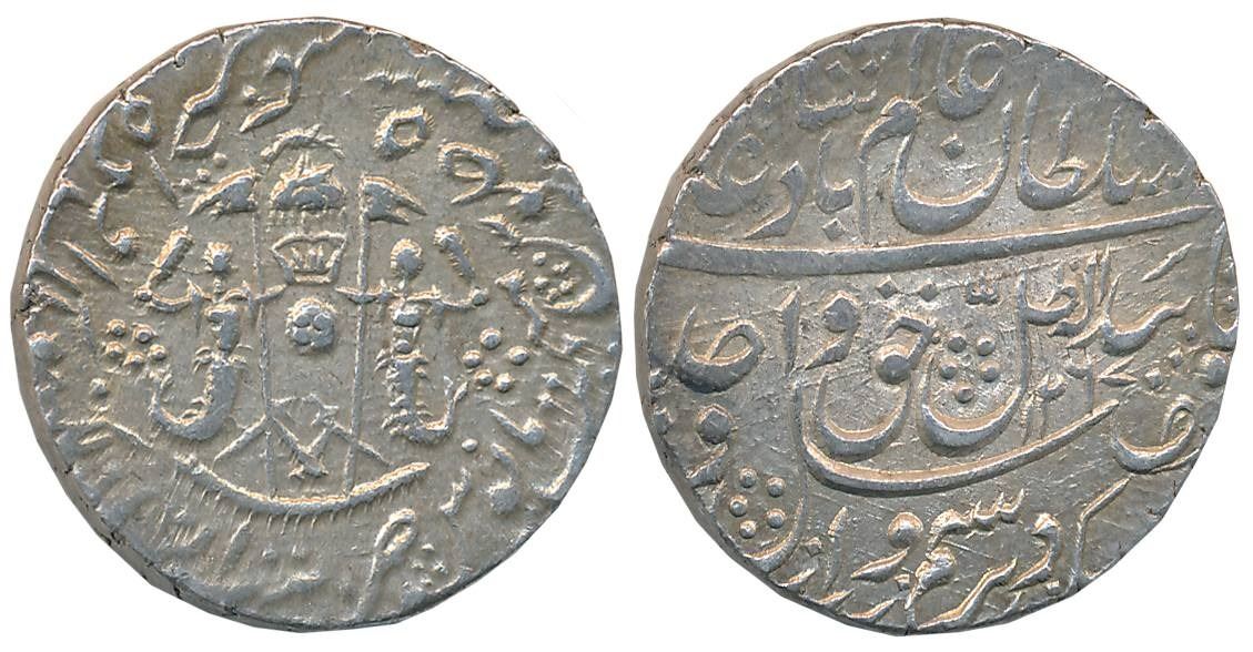 Wajid Ali Shah, Silver Rupee, 11.10g, Mulk Awadh Bait us Sultanate Lakhnau Mint, AH 1267/ RY 5, Parasol above crown, flanked by Mermaids holding flag, crossed swords below on obverse (Master & Kapoor# 11.37). Very fine+.