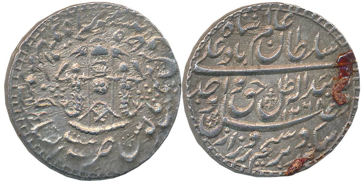 Wajid Ali Shah, Silver Rupee, 11.13g, Bait us Sultanate Lakhnau Mulk Awadh Akhtarnagar Mint, AH 1268/ RY 5, Parasol above crown, flanked by Mermaids holding flag, crossed swords below on obverse (Master & Kapoor# 11.42). Very fine+.
