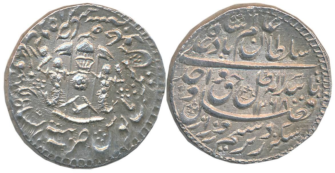 Wajid Ali Shah, Silver Rupee, 11.13g, Bait us Sultanate Lakhnau Mulk Awadh Akhtarnagar Mint, AH 1268/ RY 5, Parasol above crown, flanked by Mermaids holding flag, crossed swords below on obverse (Master & Kapoor# 11.42). About extremely fine.