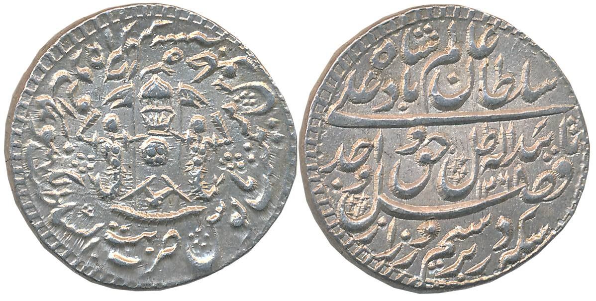 Wajid Ali Shah, Silver Rupee, 11.14g, Bait us Sultanate Lakhnau Mulk Awadh Akhtarnagar Mint, AH 1268/ RY 5, Parasol above crown, flanked by Mermaids holding flag, crossed swords below on obverse (Master & Kapoor# 11.42). Extremely fine, rare.