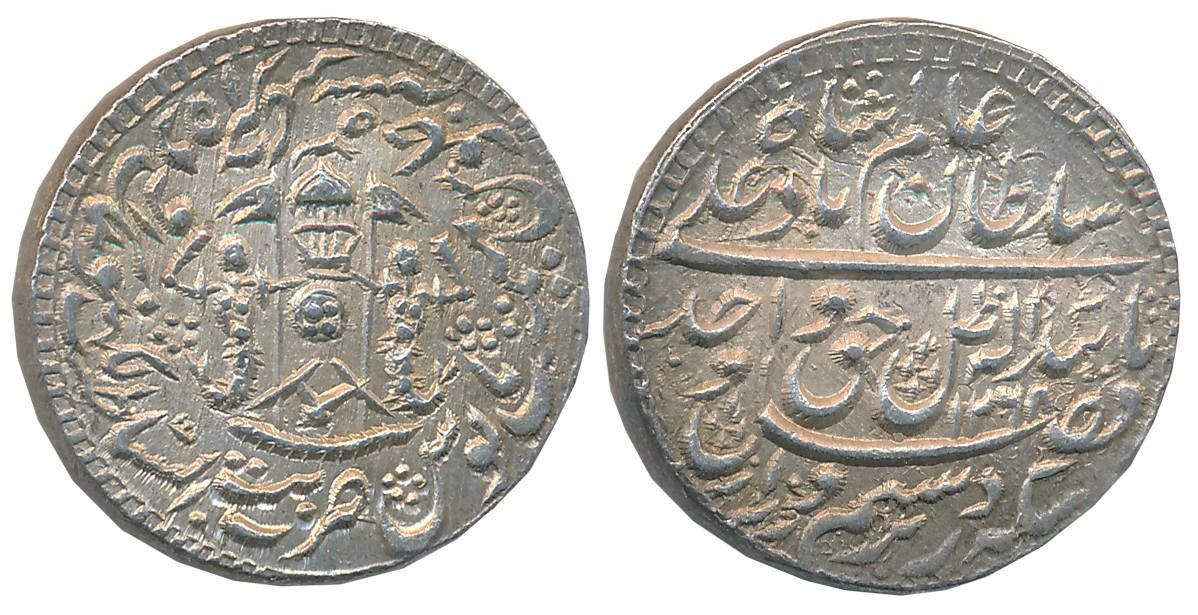 Wajid Ali Shah, Silver Rupee, 11.16g, Bait us Sultanate Lakhnau Mulk Awadh Akhtarnagar Mint, AH 1268/ RY 5, Parasol above crown, flanked by Mermaids holding flag, crossed swords below on obverse (Master & Kapoor# 11.42). Extremely fine+, rare.