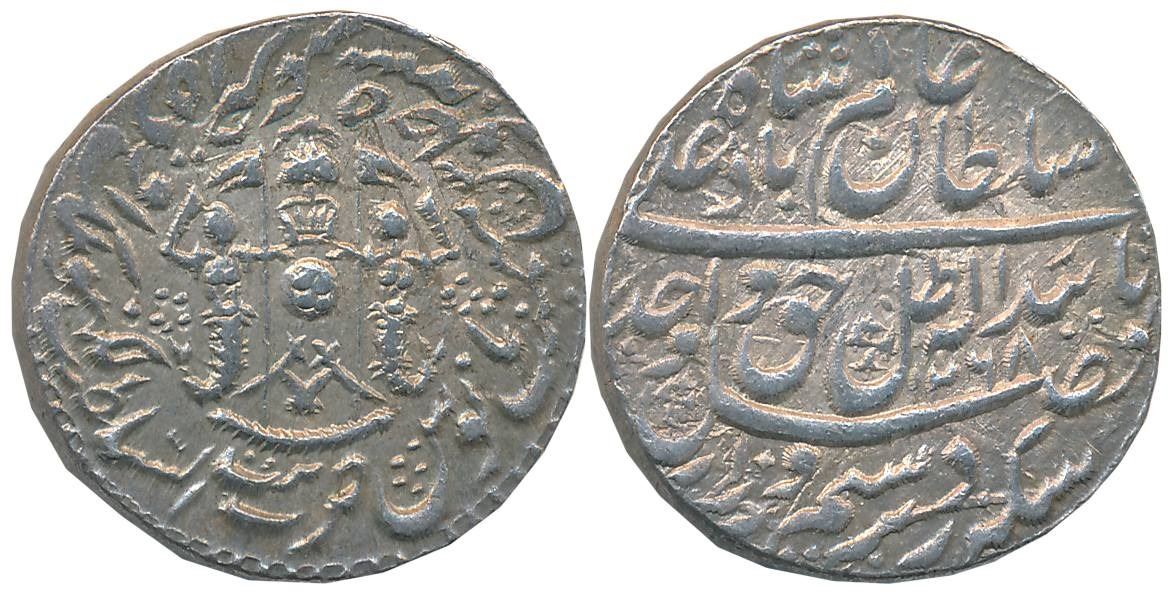 Wajid Ali Shah, Silver Rupee, 11.12g, Bait us Sultanate Lakhnau Mulk Awadh Akhtarnagar Mint, AH 1268/ RY 5, Parasol above crown, flanked by Mermaids holding flag, crossed swords below on obverse (Master & Kapoor# 11.42). Very fine+.