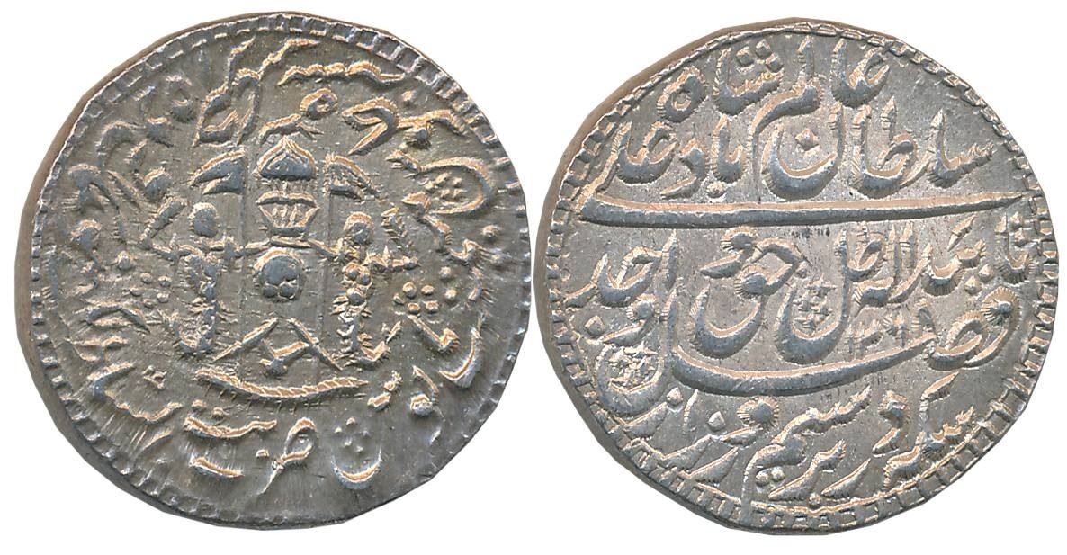Wajid Ali Shah, Silver Rupee, 11.15g, Bait us Sultanate Lakhnau Mulk Awadh Akhtarnagar Mint, AH 1268/ RY 5, Parasol above crown, flanked by Mermaids holding flag, crossed swords below on obverse (Master & Kapoor# 11.42). About extremely fine.