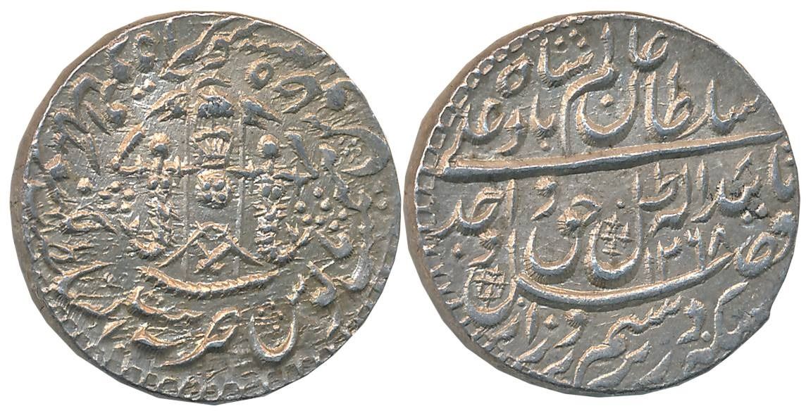 Wajid Ali Shah, Silver Rupee, 11.17g, Bait us Sultanate Lakhnau Mulk Awadh Akhtarnagar Mint, AH 1268/ RY 5, Parasol above crown, flanked by Mermaids holding flag, crossed swords below on obverse (Master & Kapoor# 11.42). Extremely fine.