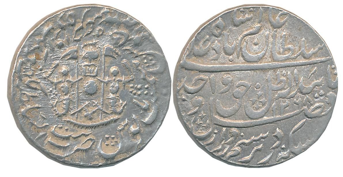 Wajid Ali Shah, Silver Rupee, 11.14g, Bait us Sultanate Lakhnau Mulk Awadh Akhtarnagar Mint, AH 1268/ RY 5, Parasol above crown flanked by Mermaids holding flag crossed swords below on obverse (Master & Kapoor# 11.42). Very fine.