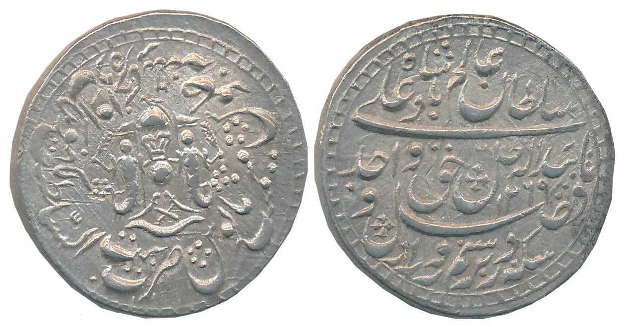 Wajid Ali Shah, Silver Rupee, 11.15g, Broad flan, Baitu us Sultanate Lakhnau Mulk Awadh Akhtarnagar Mint, AH 1269/ RY 6, Parasol above crown flanked by Mermaids holding flag crossed swords below on obverse (Master & Kapoor# 11.48). About extremely fine.