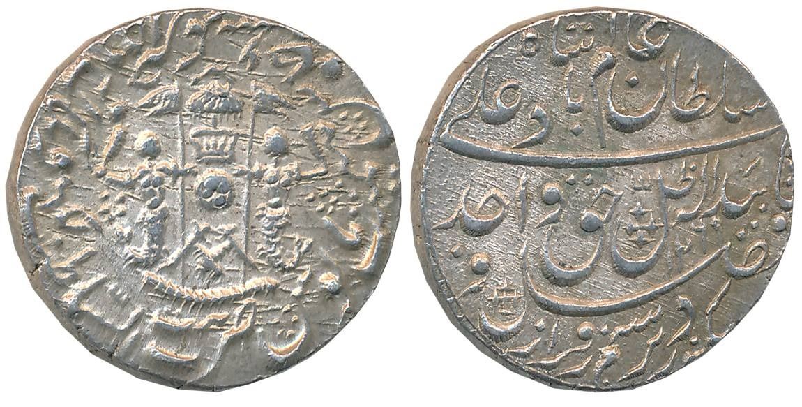 Wajid Ali Shah, Silver Rupee, 11.12g, Baitu us Sultanate Lakhnau Mulk Awadh Akhtarnagar Mint, AH 1269/ RY 6, Parasol above crown flanked by Mermaids holding flag crossed swords below on obverse (Master & Kapoor# 11.48). Extremely fine.