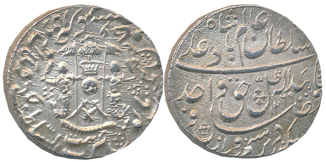 Wajid Ali Shah, Silver Rupee, 11.14g, Baitu us Sultanate Lakhnau Mulk Awadh Akhtarnagar Mint, AH 1269/ RY 6, Parasol above crown flanked by Mermaids holding flag crossed swords below on obverse (Master & Kapoor# 11.48). Extremely fine.