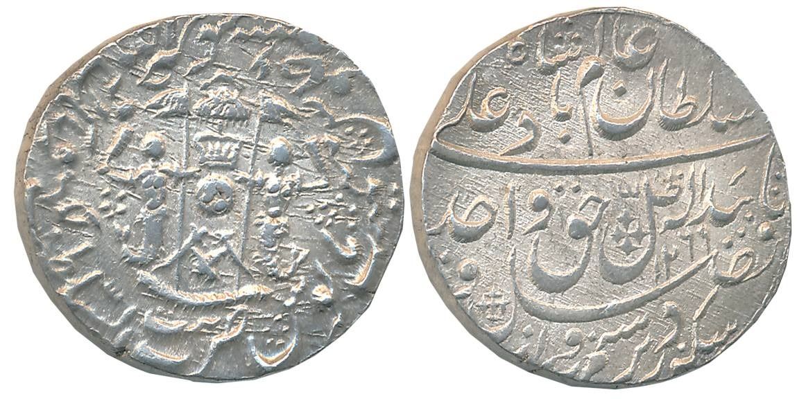 Wajid Ali Shah, Silver Rupee, 11.13g, Baitu us Sultanate Lakhnau Mulk Awadh Akhtarnagar Mint, AH 1269/ RY 6, Parasol above crown flanked by Mermaids holding flag crossed swords below on obverse (Master & Kapoor# 11.48). Very fine+.