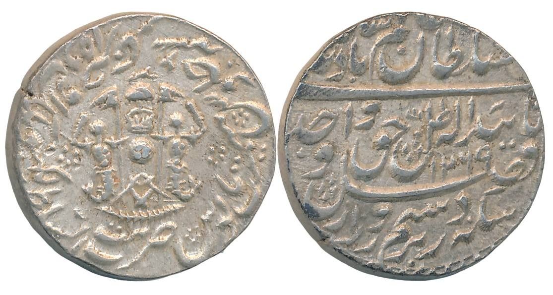 Wajid Ali Shah, Silver Rupee, 11.16g, Bait us Sultanate Lakhnau Mulk Awadh Akhtarnagar Mint, AH 1269/ RY 6, Parasol above crown, flanked by Mermaids holding flag, crossed swords below on obverse (Master & Kapoor# 11.49). Very fine.