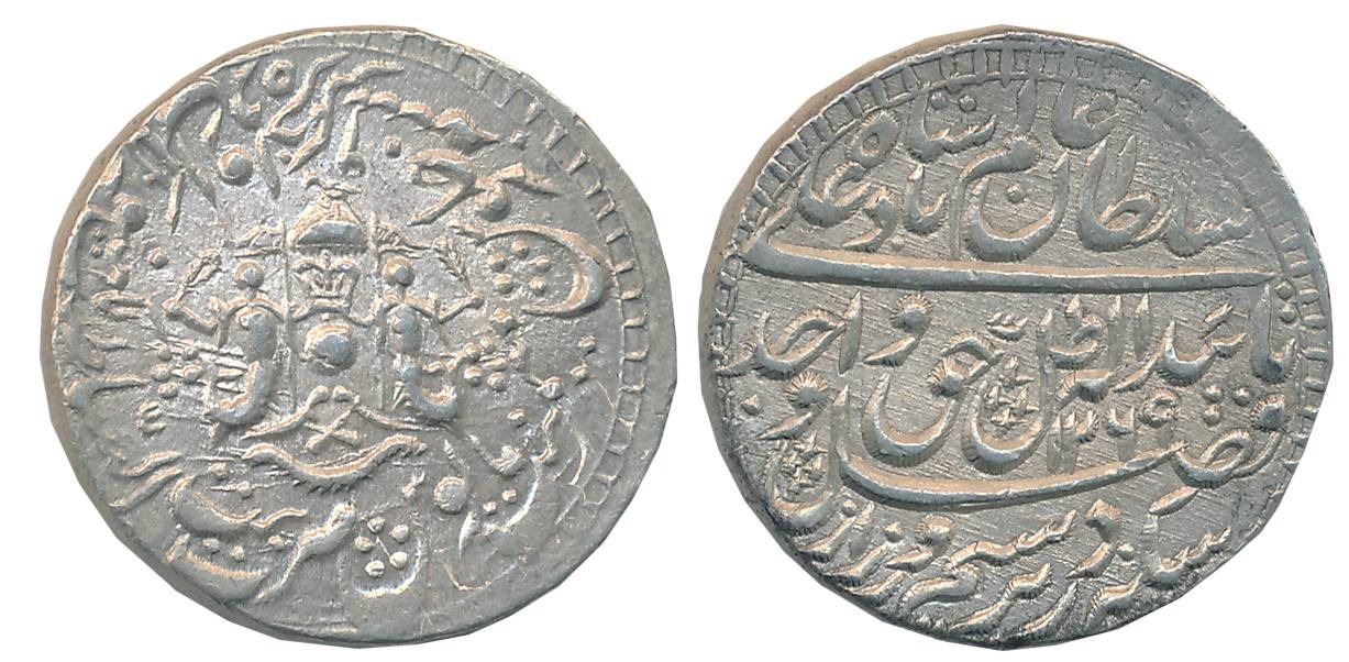 Wajid Ali Shah, Silver Rupee, 11.13g, Baitu us Sultanate Lakhnau Mulk Awadh Akhtarnagar Mint, AH 1269/ RY 9, Parasol above crown flanked by Mermaids holding flag crossed swords below on obverse (RY Not listed in Master & Kapoor). Extremely fine.
