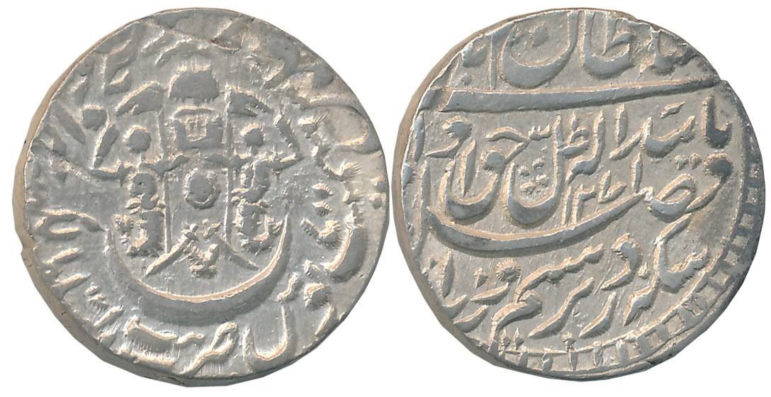 Wajid Ali Shah, Silver Rupee, 11.10g, Bait us Sultanate Lakhnau Mulk Awadh Akhtarnagar Mint, AH 1271/ RY 8, Parasol above crown flanked by Mermaids, crossed swords below on obverse (Master & Kapoor# 11.69). Very fine.