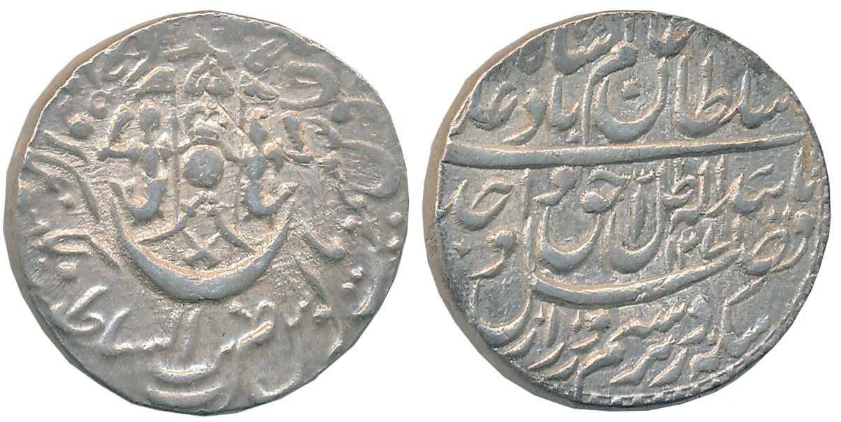 Awadh Wajid Ali Shah, Silver Rupee, 11.14g, Bait us Sultanate Lakhnau Mulk Awadh Akhtarnagar Mint, AH 1271/ RY 9, Parasol above crown flanked by Mermaids, crossed swords below on obverse (Master & Kapoor# 11.72). Very fine.