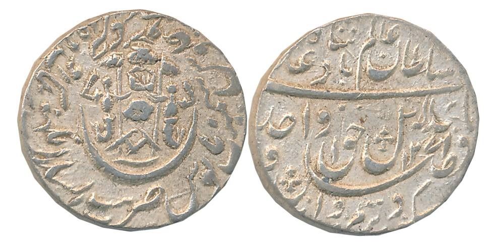 Wajid Ali Shah, Silver 1/2 Rupee, 5.53g, Bait us Sultanate Lakhnau Mulk Awadh Akhtarnagar Mint, AH 1271/ RY 9, Parasol above crown flanked by Mermaids, crossed swords below on obverse (Master & Kapoor# 11.74). About extremely fine, very rare.