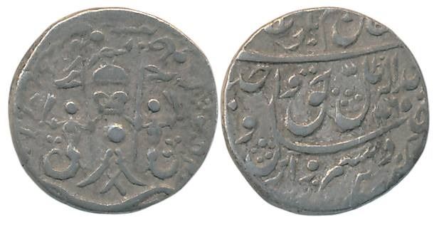 Wajid Ali Shah, Silver 1/8 Rupee- 2 Anna, 1.25g, Mulk Awadh Bait us Sultanate Lakhnau Mint, AH 1265, Parasol above crown flanked by Mermaids, crossed swords below on obverse (Master & Kapoor# 11.15). Very fine, rare.