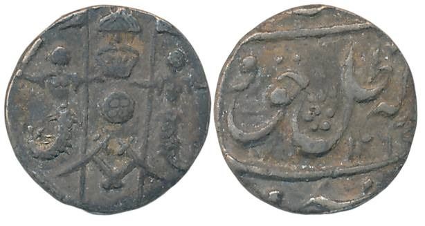 Wajid Ali Shah, Silver 1/8 Rupee- 2 Anna, 1.35g, Bait us Sultanate Lakhnau Mulk Awadh Akhtarnagar Mint, AH 1267, Obv: Legend, Rev: Parasol above crown flanked by Mermaids, crossed swords below on obverse (Master & Kapoor# 11.46). Very fine, very rare.