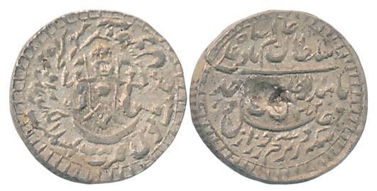 Wajid Ali Shah, Silver 1/16 Rupee- 1 Anna, 0.70g, Bait us Sultanate Lakhnau Mulk Awadh Akhtarnagar Mint, AH 1267, Obv: Legend, Rev: Parasol above crown flanked by Mermaids, crossed swords below on obverse (Not listed in Major catalogue). Small dent on center on obverse otherwise very fine, very rare.
