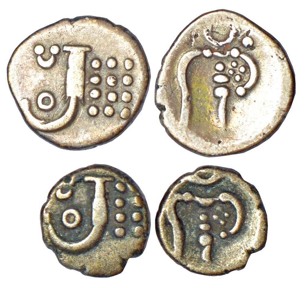 Cochin, British Protectorate, silver coins (2), 1x 2 puttuns, ND, KM 2, 1.02g and 1 puttuns, ND, KM 1, 0.33g. Obv: Sun and moon above lazy 'J' and dots. Rev: A crescent above stylized design resembling conch shell.
