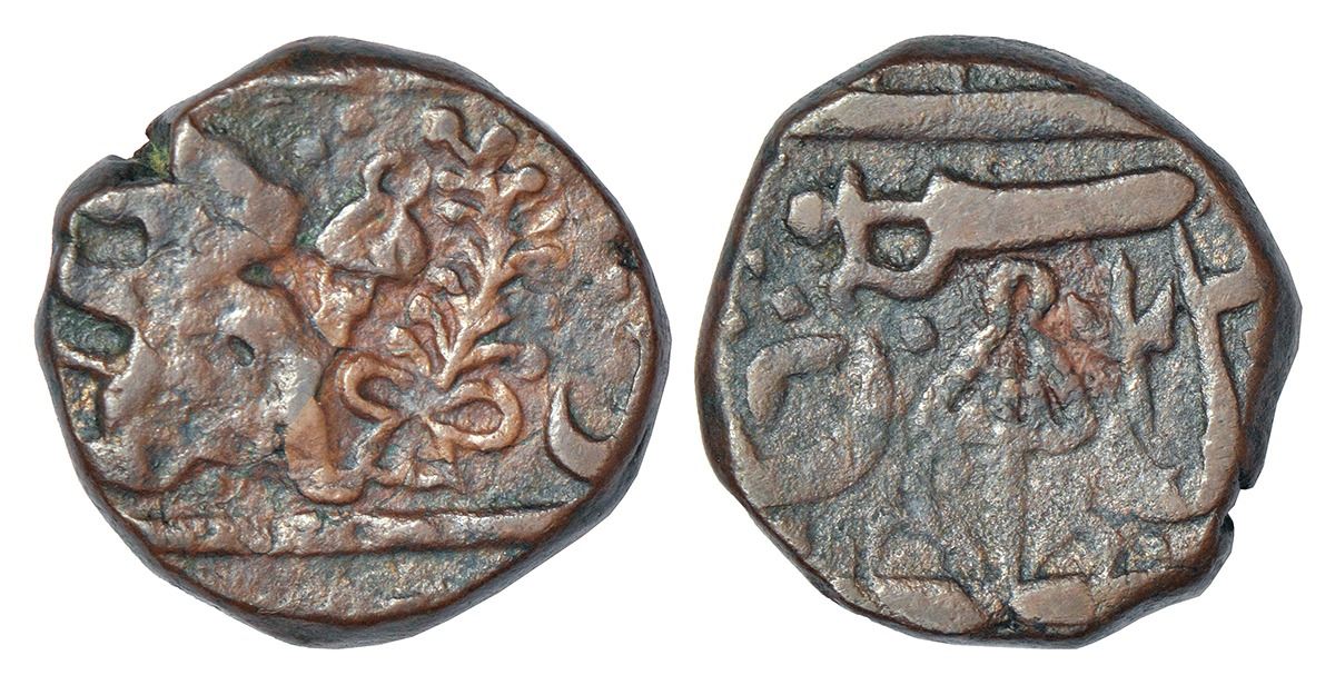 Dhar, copper paisa, in the name of Shah Alam II, unlisted on KM, 13.13g. Obv: Hanuman facing to right, holding Dronagiri mountain and flower mintmark to right. Rev: Inscription umbrella, sword and trisul mintmark.
