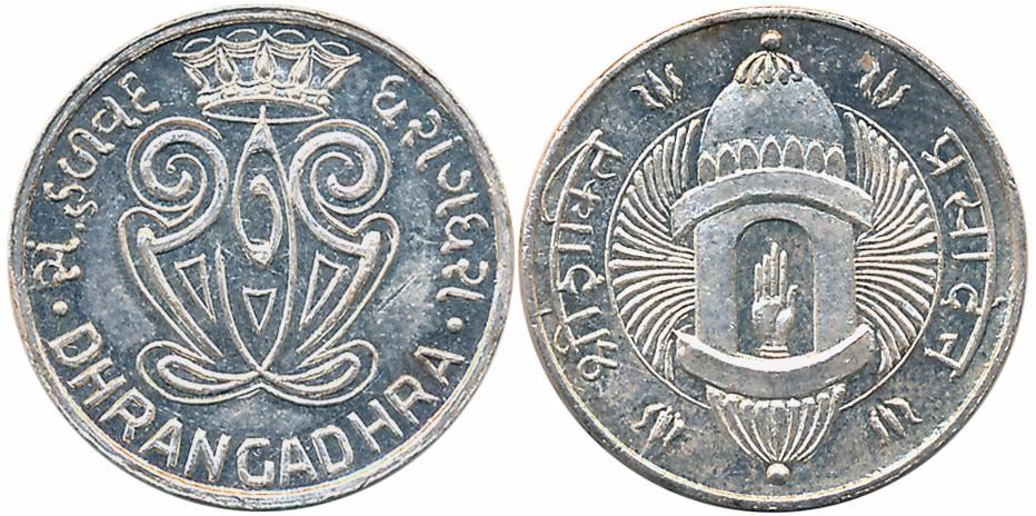 Mayuradhvaja Singhji, Silver, 5.13g, Obv: Crown royal crest of Maharaja in centre, legend around, Rev: Temple with hand in blessing mudra, Devnagari legend "Sri Shakti Prasaden" around with four tridents. Uncirculated, rare.