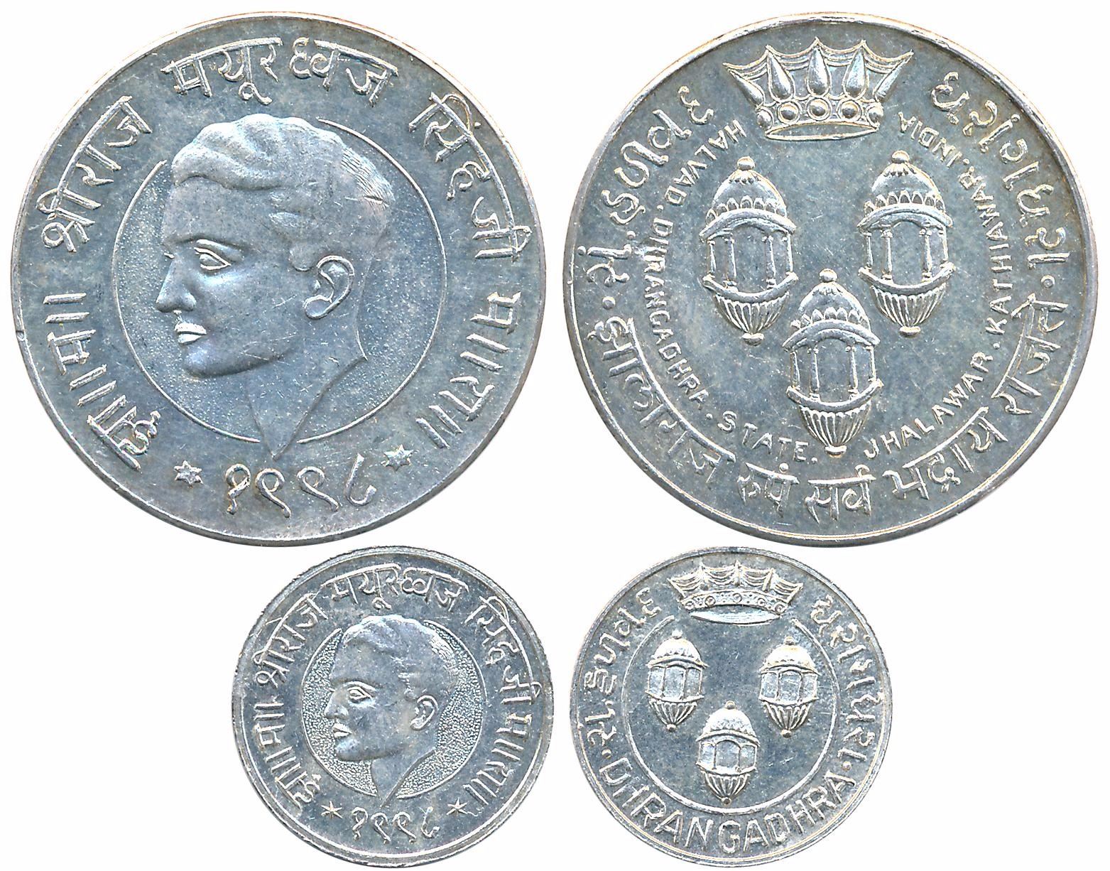Mayuradhvaja Singhji, Silver (2), 15.22g, 7.70g, Coronation series, VS 1998, Obv: Bust of Maharaja in centre, name and titles around, VS date 1998 below truncation, Rev: Three royal windows with crowned above, legend around. Uncirculated. 2.