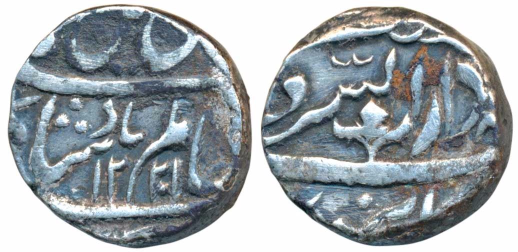 Daulat Rao (AH 1209-1243, 1794-1827 AD), Silver Rupee, 11.51g, Dar-us-Sarur Burhanpur Mint, in the name of Shah Alam II, AH 1221, a sprig as mint mark (KM 38.2). Very Fine.