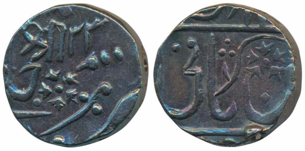 Baija Bai (AH 1243-1249, 1827-1833 AD), Silver Rupee, 10.85g, Lashkar Mint, in the name of Shah Alam II, ’Shri’ in Nagari, trishul and RY 23 on rev. (KM 129). Superb blue toning, Extremely Fine, Scarce.