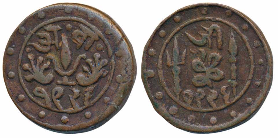 Jayaji Rao (AH 1259-1304, 1843-1886 AD), Copper Paisa, 6.58g, Lashkar Mint, obv. trident and spear with date VS 1926 below and nagari Ji above, (KM 143.1). Extremely Fine, Scarce.