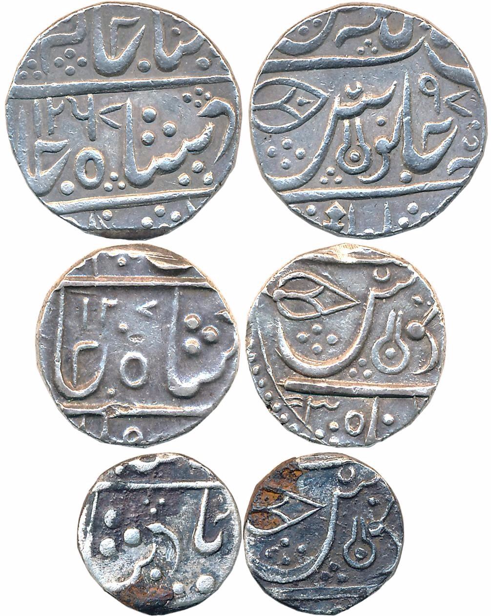 Ahalya Bai, Silver (3), Rupee, 11.20g, AH 1267/ RY 97 (KM# 58.1), 1/2 Rupee, 5.55g, AH 1208/ RY 35 (KM# 57.2) & 1/4 Rupee, 2.70g (KM# 56.2), Maheshwar Mint, in the name of Shah Alam II. Very fine to very fine+. 3 coins.