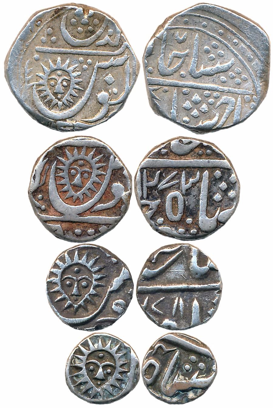 Silver (4), Rupee, 11.20g, 1/2 Rupee, 5.53g, AH 1273, 1/4 Rupee, 2.79g, AH (12)78, & 1/8 Rupee, 1.38g, AH (129)4, in the name of Shah Alam II. Very fine to very fine+. 4 coins.