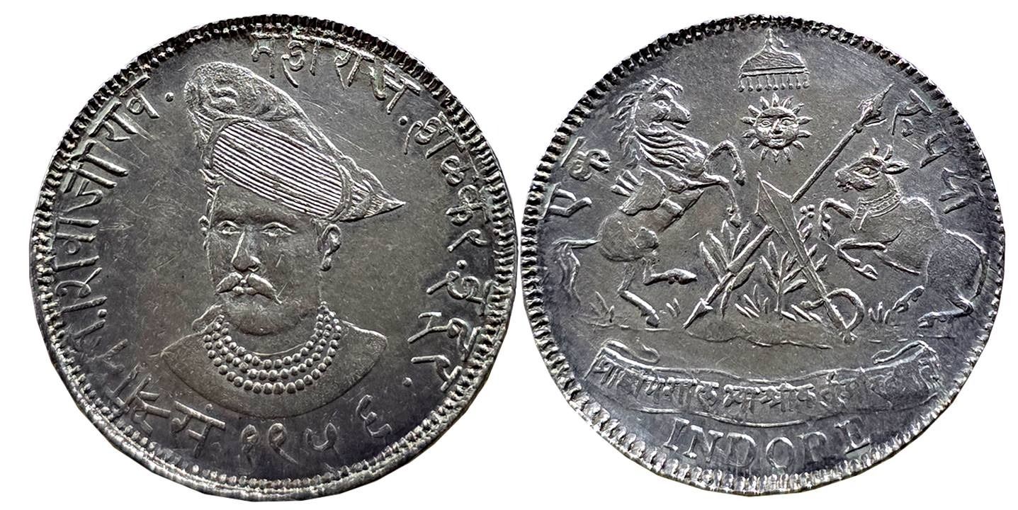 Shivaji Rao Holkar, Silver Nazarana Rupee, 11.13g, Milled issue, struck at Indore, VS1956, Obv: Frontal bust of Shivaj Rao wearing a Holkar turban and strings of pearls; Devanagari legend “Shrimant Shivaji Rao Maharaja Holkar Indur” around and VS date below, Rev: Coat of arms of the state – Crest- A Sun radiant under a Chhatri (royal umbrella). Arms- A field of poppy and wheat over which a Khanda (broadsword) and a spear in saltire. On the left, a Horse rearing and on the right, a Nandi (sacred bull) couchant. Motto- in Sanskrit – “Prahomesho labhyā Shrih Kartuh Prārabdhā”t”. (“Umesh says thus, success attends him who strives”). Denomination above and name of state (in English) below. About extremely, extremely rare.
