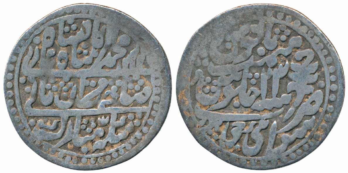 Jai Singh III (AH 1235-1251, 1819-1835 AD), Silver Nazarana Rupee, 9.29g, in the name of Muhammad Akbar II, Sawai Jaipur Mint, AH 1243/23, with Jhar in the field (KM 73). Very Fine, Very Rare.