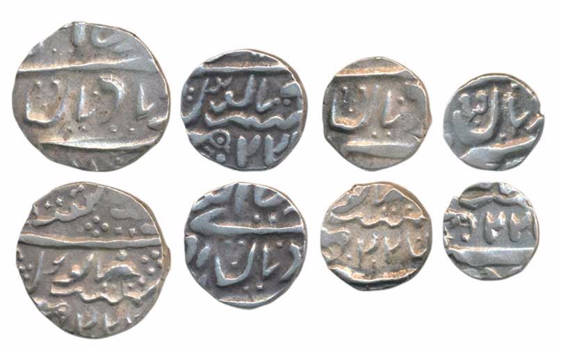 Ranjit Singh (AH 1263-1281, 1846-1864 AD), set of 4, Silver Rupee, ½, ¼ and 1/8, second series, in the name of Queen Victoria, frozen RY 22 with mint marks umbrella and bird on rev. (KM 34, 33, 32 & 31). Very Fine to Very Fine+, Very Rare as a set. (4)