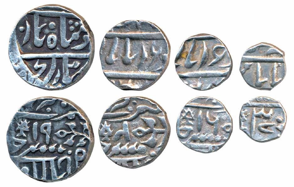 Jhalawar Mint, set of 4, Silver Rupee, ½, ¼ and 1/8, the first Old Madan Shahi series, the rest New Madan Shahi series, in the name of Queen Victoria, RY 19, 2, 16 and 37 (KM 28, 5.1, 4.1 & 3.2). Very Fine+, Rare as a set. (4) The Jhalawar symbol in the ½ rupee is inverted.