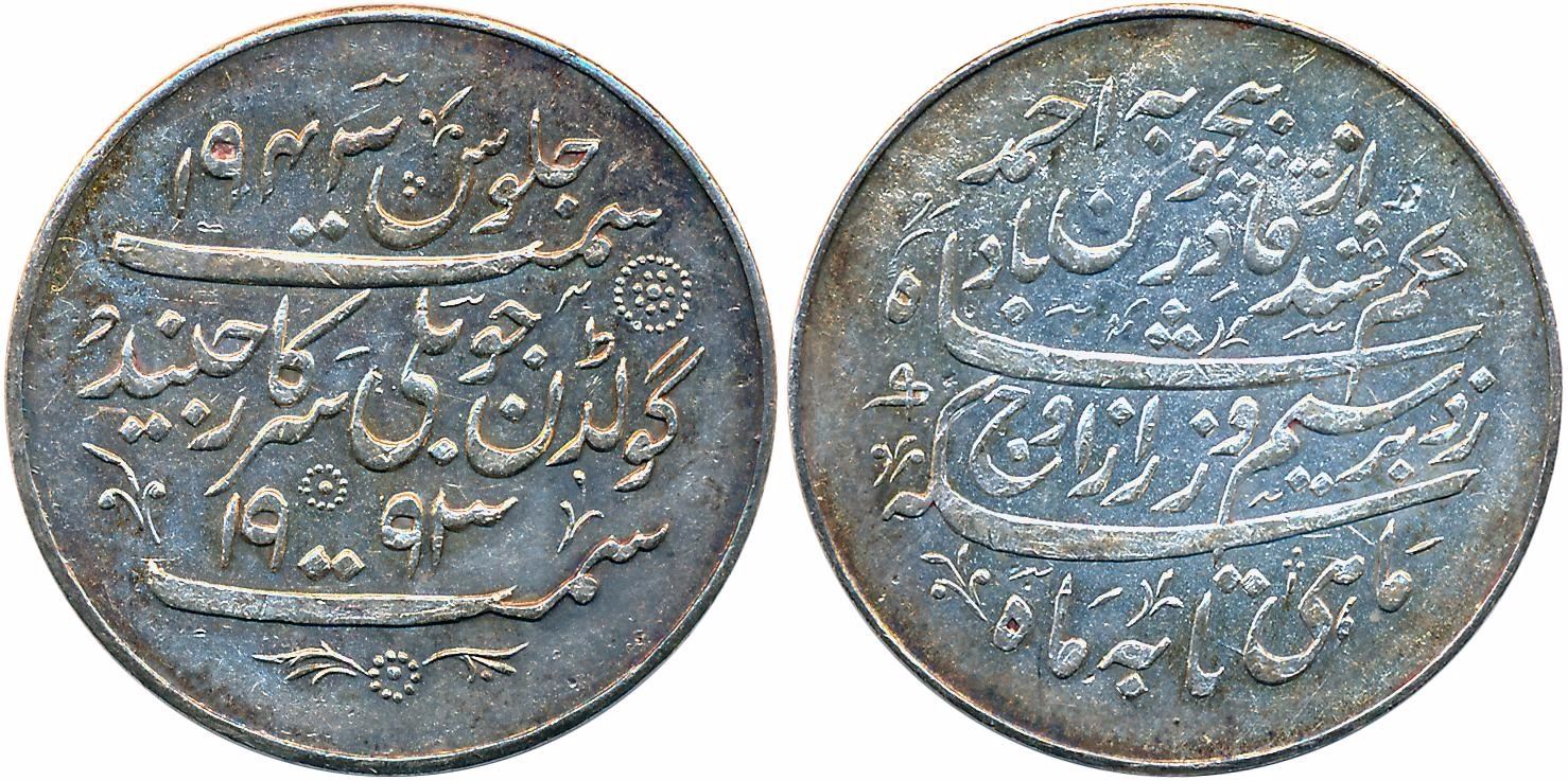 Ranbir Singh, Silver Nazarana Rupee, 11.93g, VS 1943 and 1993, issued to commemorate the 50th anniversary of Ranbir Singh’s reign (KM# Y2). Extremely fine+, very rare.